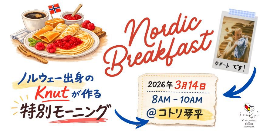 琴平 ノルウェーモーニング by Knut@コトリ 2026.03.14 8:00 ~ 10:00 AM ノルウェー出身のKnutが、コトリで特別なモーニングを提供します。ノルウェーのエッセンスを取り入れた、いつもとは少し違う朝のメニューです。旅人同士はもちろん、地域の方ともゆるく交流できる朝の時間。朝ごはんを楽しみながら、ゆったりとしたひとときを過ごしませんか?どなたでもご参加いただけます。ぜひお気軽にお越しください☀️